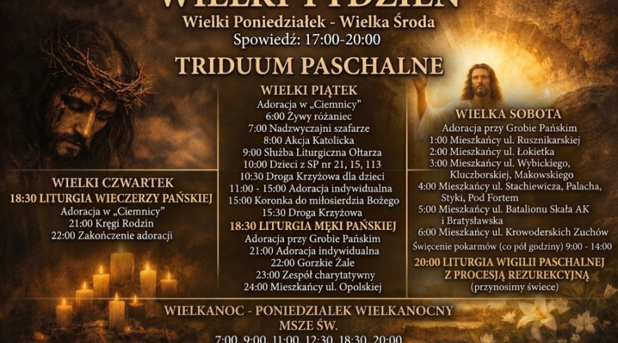 - Wielki Piątek. Dzień Śmierci Chrystusa. Adoracja w „ciemnicy” rozpocznie się o godz. 6:00 rano, a zakończy ją Koronka do Miłosierdzia Bożego o godz. 15:00. Po niej wielkopiątkowa Droga Krzyżowa dla wszystkich. O 18:30 Liturgia Męki Pańskiej, a po niej przeniesienie Najświętszego Sakramentu do Bożego Grobu i adoracja przez całą noc oraz w sobotę do godz. 16:00. Plan adoracji i całego Triduum wywieszony jest przy wyjściach z kościoła. Szczególne zaproszenie na adorację kierujemy do dzieci i młodzieży ze wszystkich szkół z terenu parafii od godz. 10.00. Wszystkich powyżej 14 roku życia obowiązuje tego dnia wstrzemięźliwość od pokarmów mięsnych, natomiast każdy pomiędzy 18 a 60 rokiem życia zobowiązany jest również do zachowania postu ścisłego.